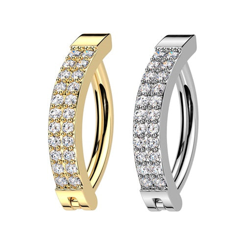 Das Design überzeugt durch zwei Reihen funkelnder Kristalle, die für einen glamourösen Look sorgen. Durch den praktischen Klickverschluss mit Scharnier lässt sich das Piercing leicht einsetzen und wieder herausnehmen, ohne zu verrutschen.