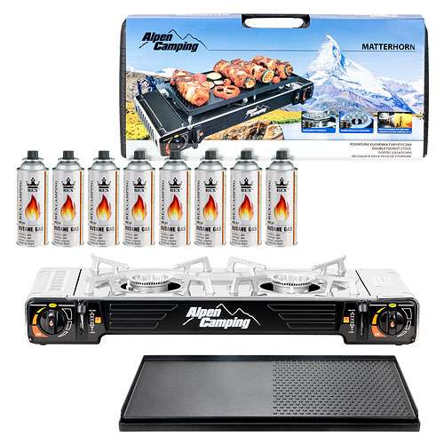 | Vorteil: | Dieser Camping Doppel Gaskocher ist ein Multifunktionsgerät mit vielen verschiedenen Funktionen. Enhalten ist ein Umfangreiches Sortiment verpackt in einem Koffer. |