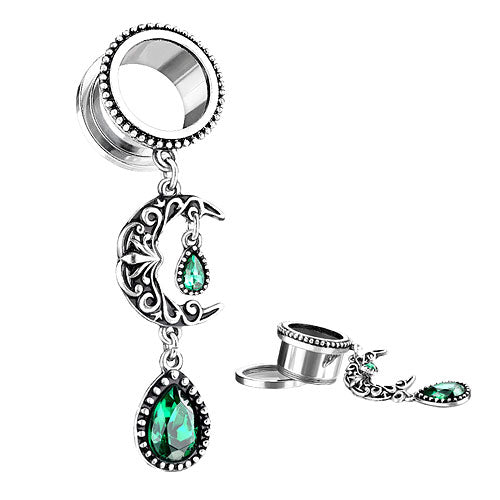 Flesh Ohr Tunnel mit Mond Anhänger Emerald Grün Kristall Tropfen