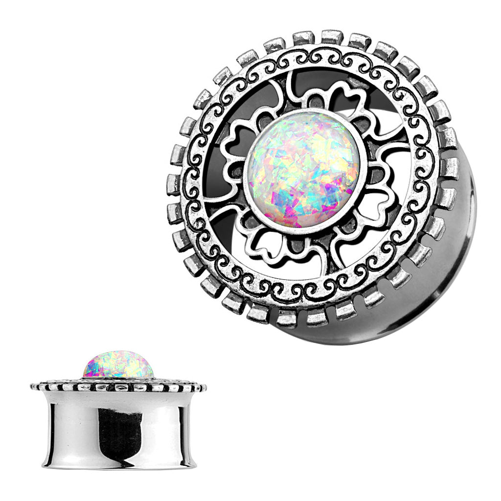 Ohr Tunnel Plug Antik Silber IP Tribal Ornament Opal Rainbow