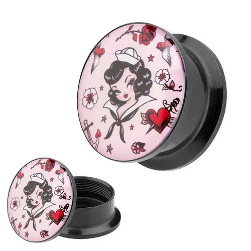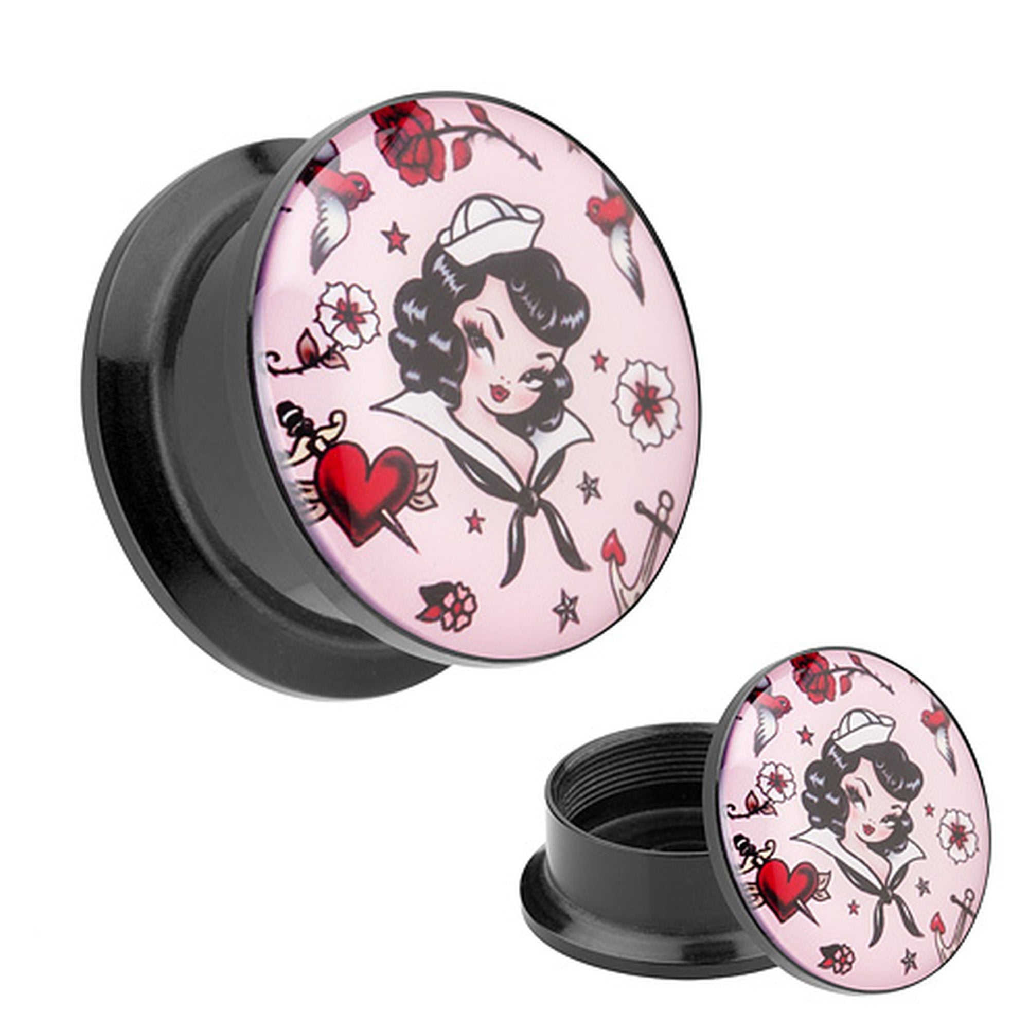 Picture Ohr Tunnel Gewinde Plug Motiv Rockabilly Matrosen Mädchen Rose & Möve
