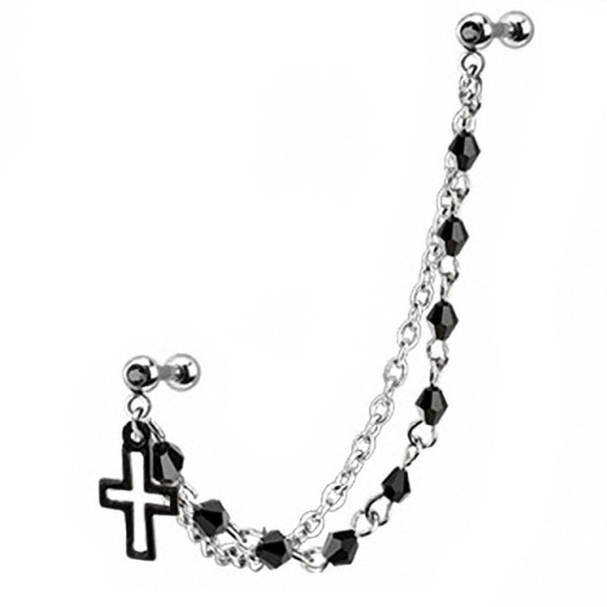 Tragus Piercing Stecker Kristall Kette Kreuz Schwarz
